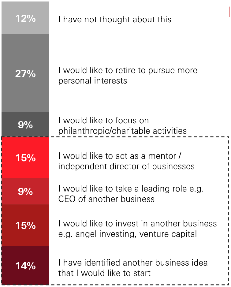 Over half (53%) of these entrepreneurs plan to stay in business in one way or another – whether that’s starting, investing or taking a leading role in a business, or even acting as a mentor. But there are other avenues too, such as focusing on philanthropic causes or even pursuing personal interests.
